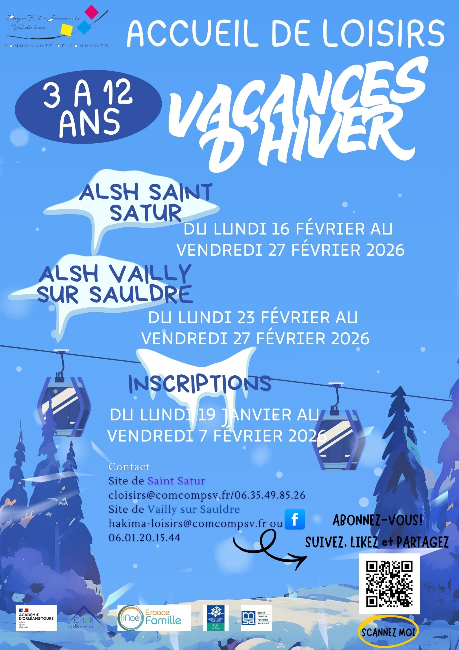 Saint-Satur L'accueil de loisirs de Saint-Satur fonctionne les mercredis en périodes scolaires et les périodes de vacances : Toussaint, Hiver, Printemps, Eté (environ 11 semaines par an). Les équipes d'animateurs accueillent les enfants de 3 à 12 ans de 7h30 à 18h30. Vailly-sur-Sauldre L'accueil de loisirs de Vailly sur Sauldre fonctionne les périodes de vacances : Toussaint, Hiver, Printemps (1 semaine), Eté (5 semaines). Les équipes d'animateurs accueillent les enfants de 3 à 12 ans de 8h00 à 18h00.