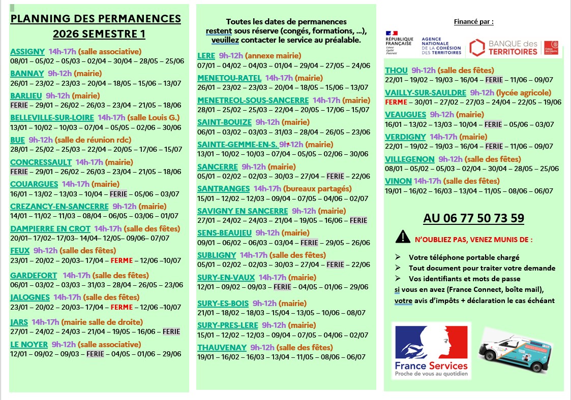 France Services Mobile est un service vous accompagnant dans les démarches administratives au quotidien. Il se déplace sur 34 communes de la CDC Pays Fort-Sancerrois-Val de Loire. Deux agents vous accueillent dans un lieu de vie agréable et convivial lors de permanences effectuées soit le matin, soit l'après-midi suivant le planning sur l'ensemble du territoire.